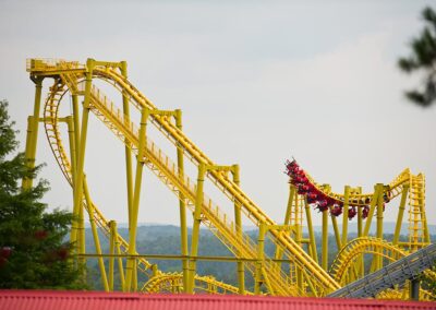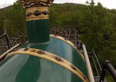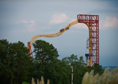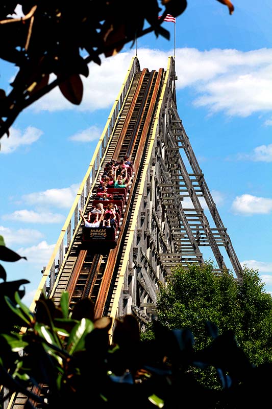 This ride was one of William L “Bill” Cobb’s many masterpieces in roller coaster engineering. Its original home was in Florida where it operated under the names Roaring Tiger and Florida Hurricane. It was a favorite ride of pop star Michael Jackson when he was on a shoot for a few weeks in that area. Magic Springs purchased the ride in 1991 and it was transported to the park, from Florida, in 40 semi-trailers. It opened in 1992 with the first ride on May 30. Since that time, multiple generations of Arkansans have shrieked and screamed up and down its track.