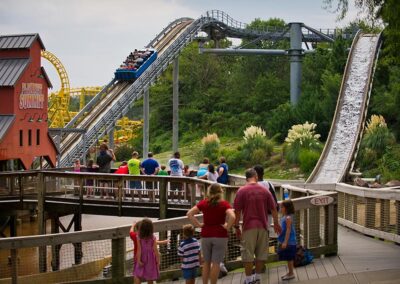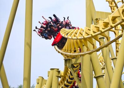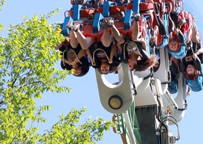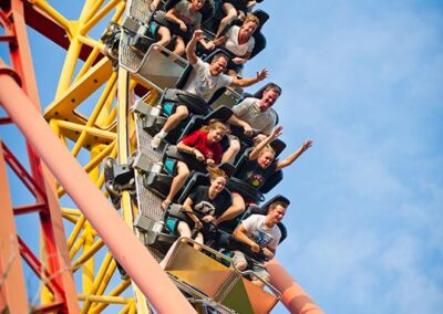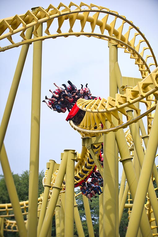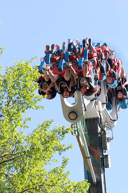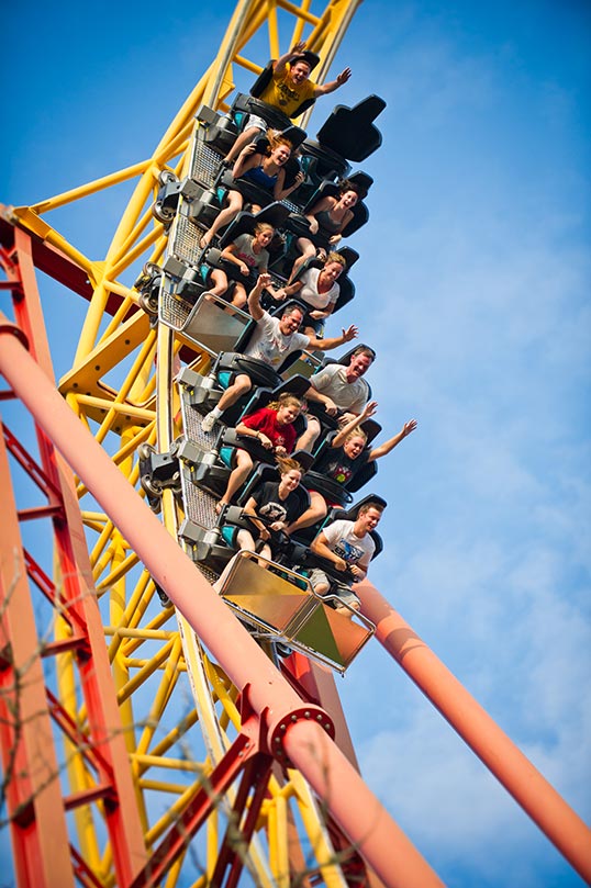 The challenge is issued the moment you gaze up to Gauntlet as you make your way toward the park’s entrance. It’s a huge, bright yellow monument to mental mayhem looping into the sky. Will you or won’t you? It takes nerves of steel to endure this 110-foot drop into a whirling dervish of five inverted loops and mind-blowing bends. You’ll feel strong side-to-side, up-and-down, and front-to-back forces traveling 2,200 feet of steel coaster insanity all while suspended under the coaster’s tracks at speeds up to 50 mph. Feet dangling, adrenaline pumping, hearts thumping…this is the very definition of a thrill ride.