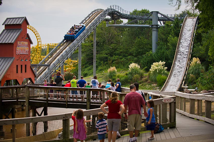 Load a raft with your best buds and hit the river – that is if you don’t mind a tidal wave! The best way to a quick cool-down in the Arkansas heat is wild dive down Plummet Summit. After a scenic ascent to the top of the lift hill, your boat is released into a wide trough, traversing a 180-degree curve, and finally tilting over the top of the 50-foot chute, quickly accelerating to 34 mph as you crash into 1,500 gallons of flowing water. The chills and spills from this one will hang around long after you’ve taken the plunge. On your way out, be sure to stop on the bridge for a fresh soaking from the next rafters headed down the river!