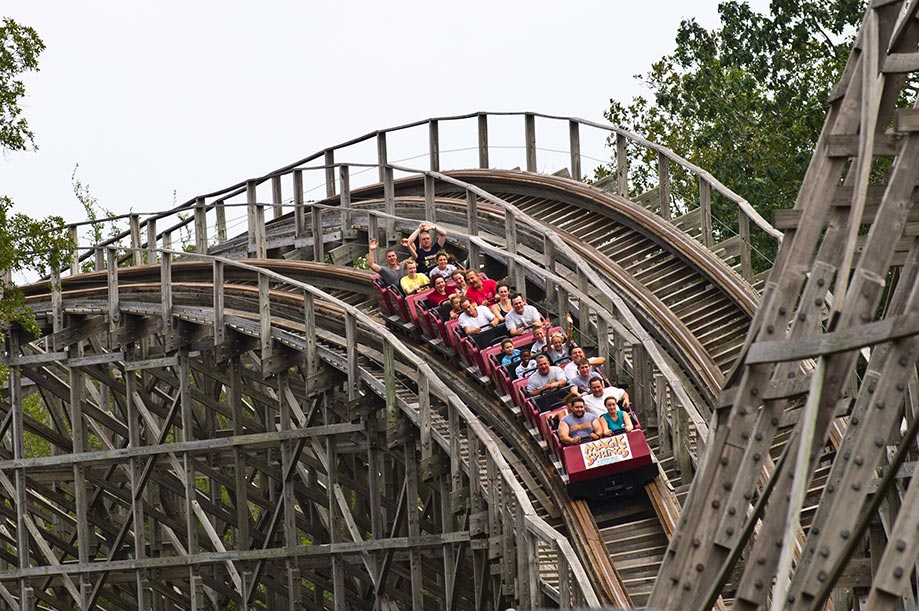 Hundreds of thousands of feet of wooden boards zig –zag high above Timberwood Amphitheater to create the park’s marquee ride – Arkansas Twister. This classic out-and-back coaster heads out of the station to transport riders to the top of its lift hill after which it releases to a 92-foot drop propelling you through an up-and-down journey across 3,500 feet of track at top speeds of 50 mph. You’ll experience the sensation of weightlessness, alternating with periods of downward force nearly three times the force of gravity!